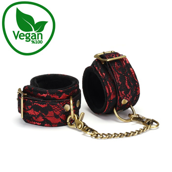 ( ilość produktów: 212 )Wegańskie kajdanki na ręce ze skóry wegańskiej, z miękką podszewką, zdobione czerwoną koronką, z okuciami i łańcuchem z metalu w kolorze mosiądzu
