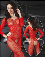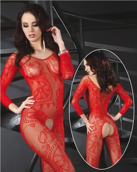 Siatkowy kostium bodystocking z długim rękawem, koronkowym wzorem i otwartym krokiem, połączone z pończochami, ONE SIZE XL-4XL