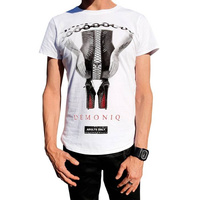 Biała koszulka męska z nadrukiem kucającej kobiety