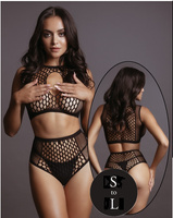 Siatkowy kostium bodystocking z długim rękawem, koronkowym wzorem i otwartym krokiem, połączone z pończochami, ONE SIZE XL-4XL