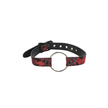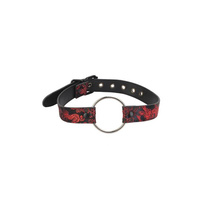 ( ilość produktów: 22 )Elegancki otwarty knebel typu O-ring z opaską z ekoskóry zdobionej czerwonym haftem seria DELUXE BDSM
