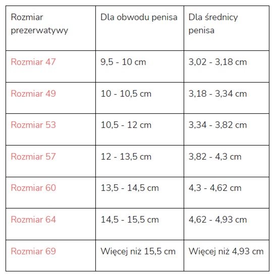 Rozmiar prezerwatywy podawany jest zawsze jako szerokość nominalna w milimetrach, np. 47mm, 60mm lub 69mm. Ta nominalna szerokość wynika z szerokości prezerwatywy leżącej płasko. Jednak ten pomiar ma niewiele wspólnego z rzeczywistością, bo penis jest okrągły, a nie płaski. Aby pomóc w wyborze właściwego rozmiaru prezerwatywy, powstała przeliczeniową (poniżej).